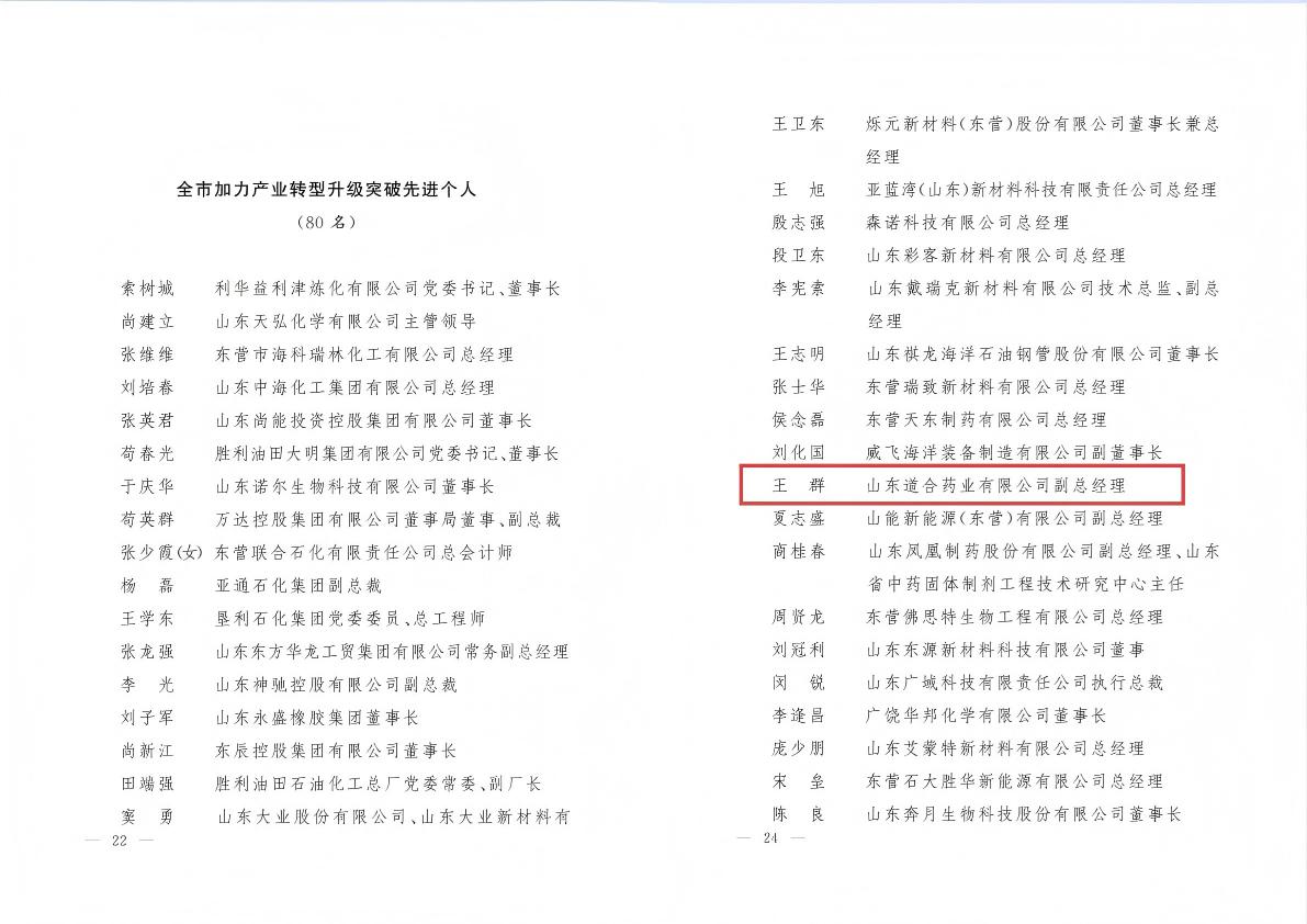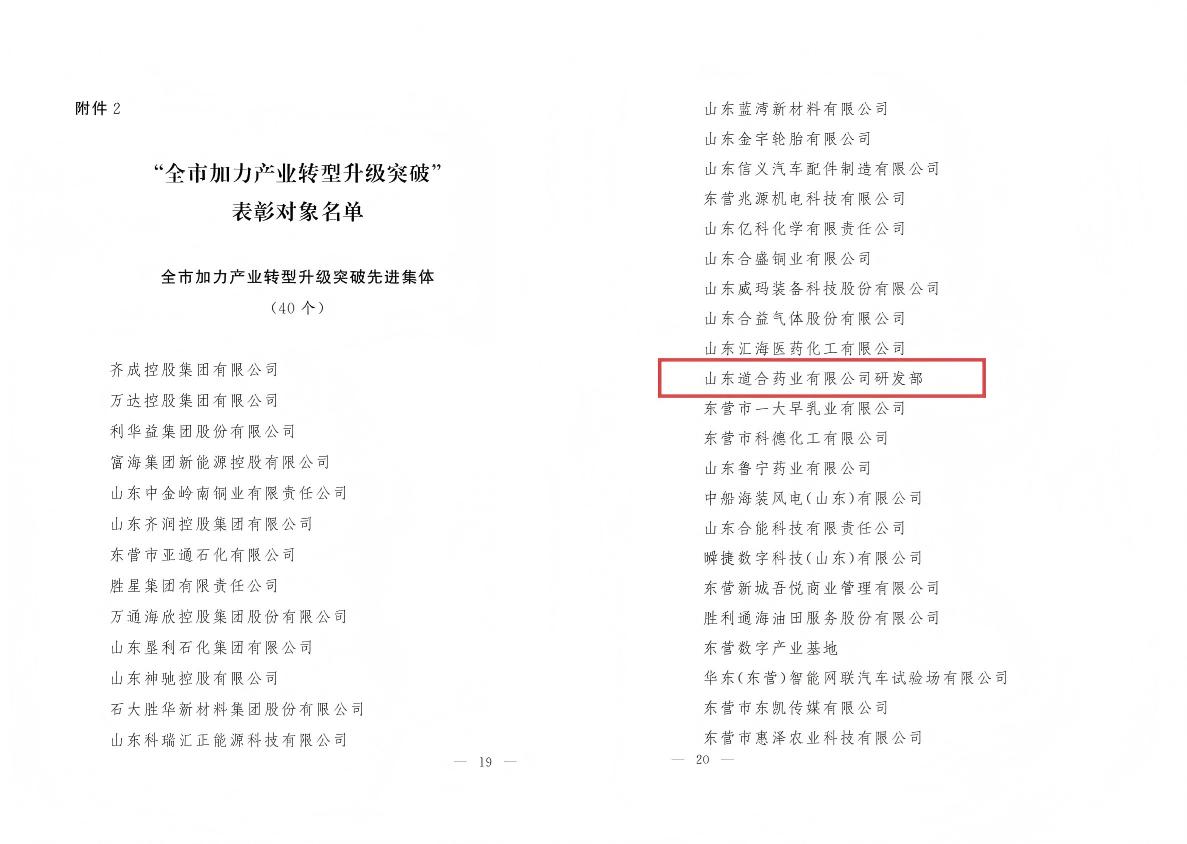 此次表彰中,山东道合药业有限公司研发部荣获“东营市加力产业转型升级突破先进集体”称号,道合药业副总经理王群同志被授予“东营市加力产业转型升级突破先进个人”称号。