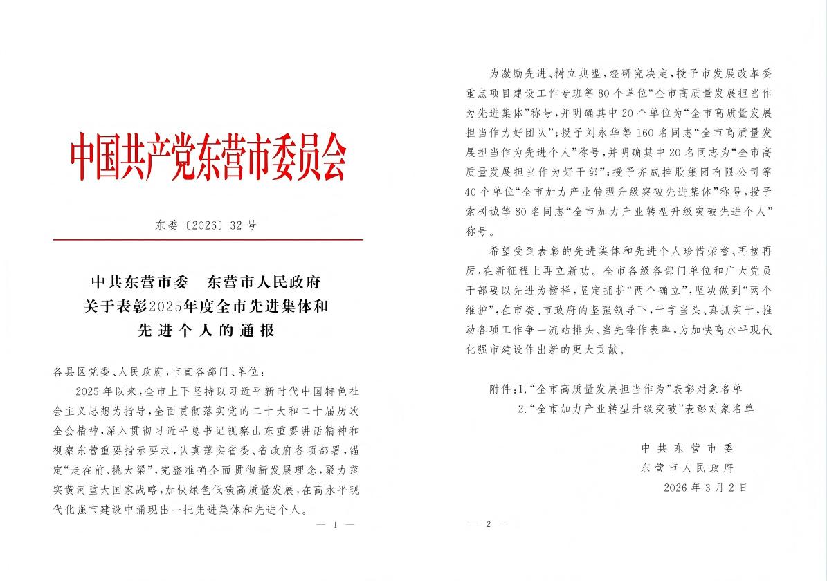 会上宣读了东营市委、市政府关于表彰2025年度全市先进集体和先进个人的通报,为受表彰对象进行了颁奖,激励全市上下凝心聚力、奋勇争先,全力加快产业转型升级、推动高质量发展。